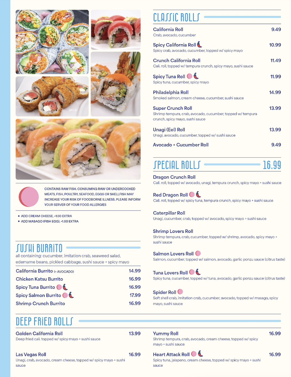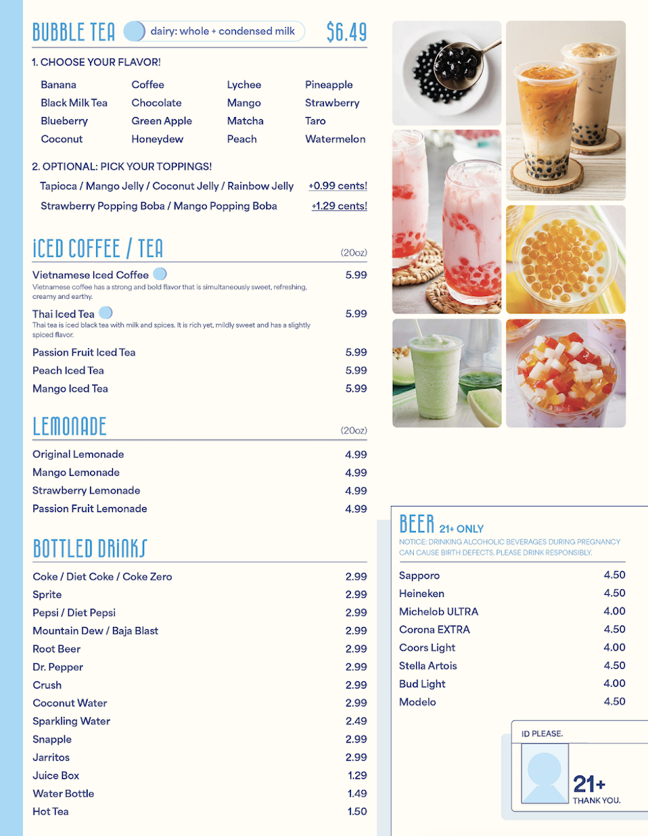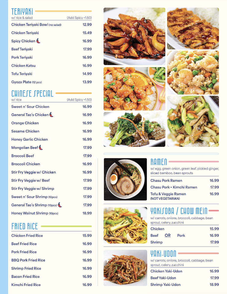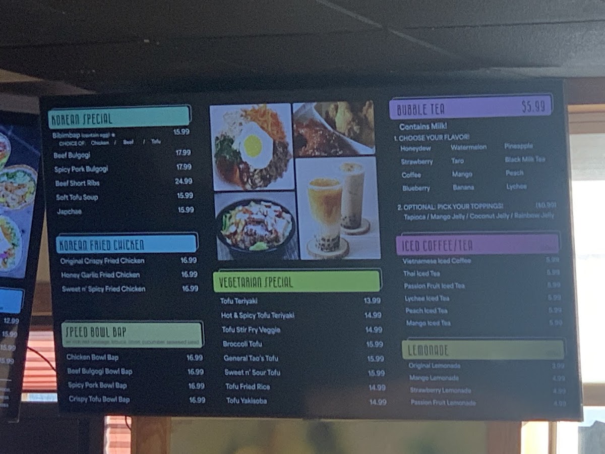 The menu features a variety of dishes that reflect authentic flavors, from hearty bowls like Bibimbap and Beef Rib-Eye Steak Pho to shareable appetizers such as Spring Rolls and Crab Rangoon. Sushi burritos and flavorful noodle dishes like Pad Thai and Yakisoba provide a satisfying option for those seeking something a bit lighter but still full of character.